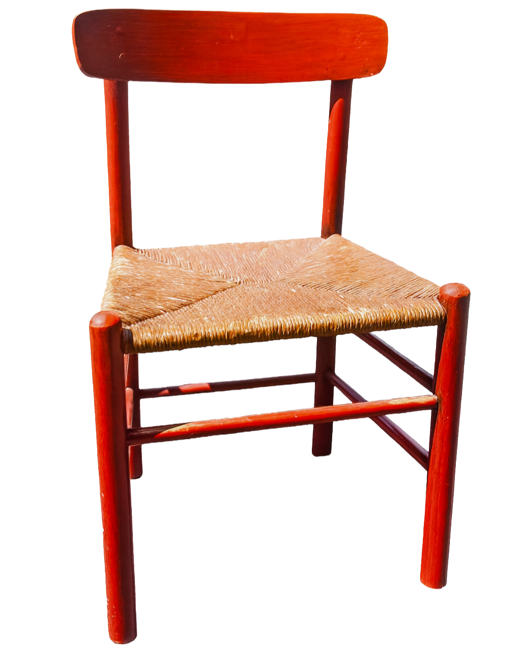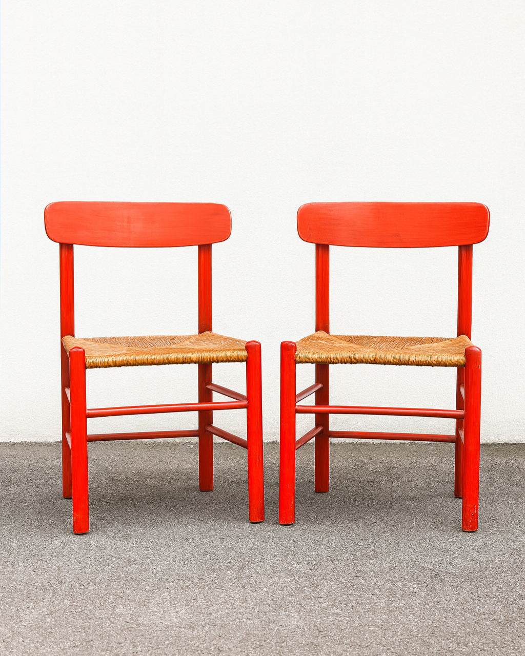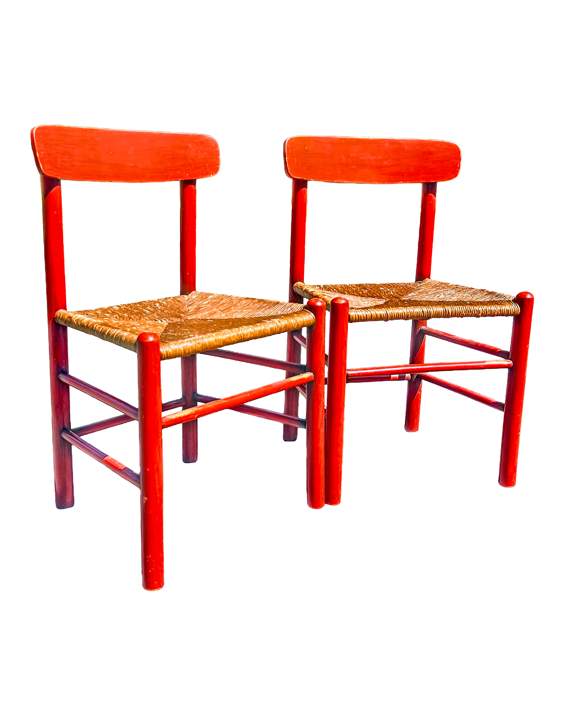 Timeless Børge Mogensen J39 chairs (set of 2) with a rare painted finish and rustic seating — perfect for collectors of Danish modern or anyone wanting a splash of Scandinavian character in their space. These examples feature a bold orange/red painted beechwoodframe paired with classic handwoven rush seats in a traditional four-part weave.